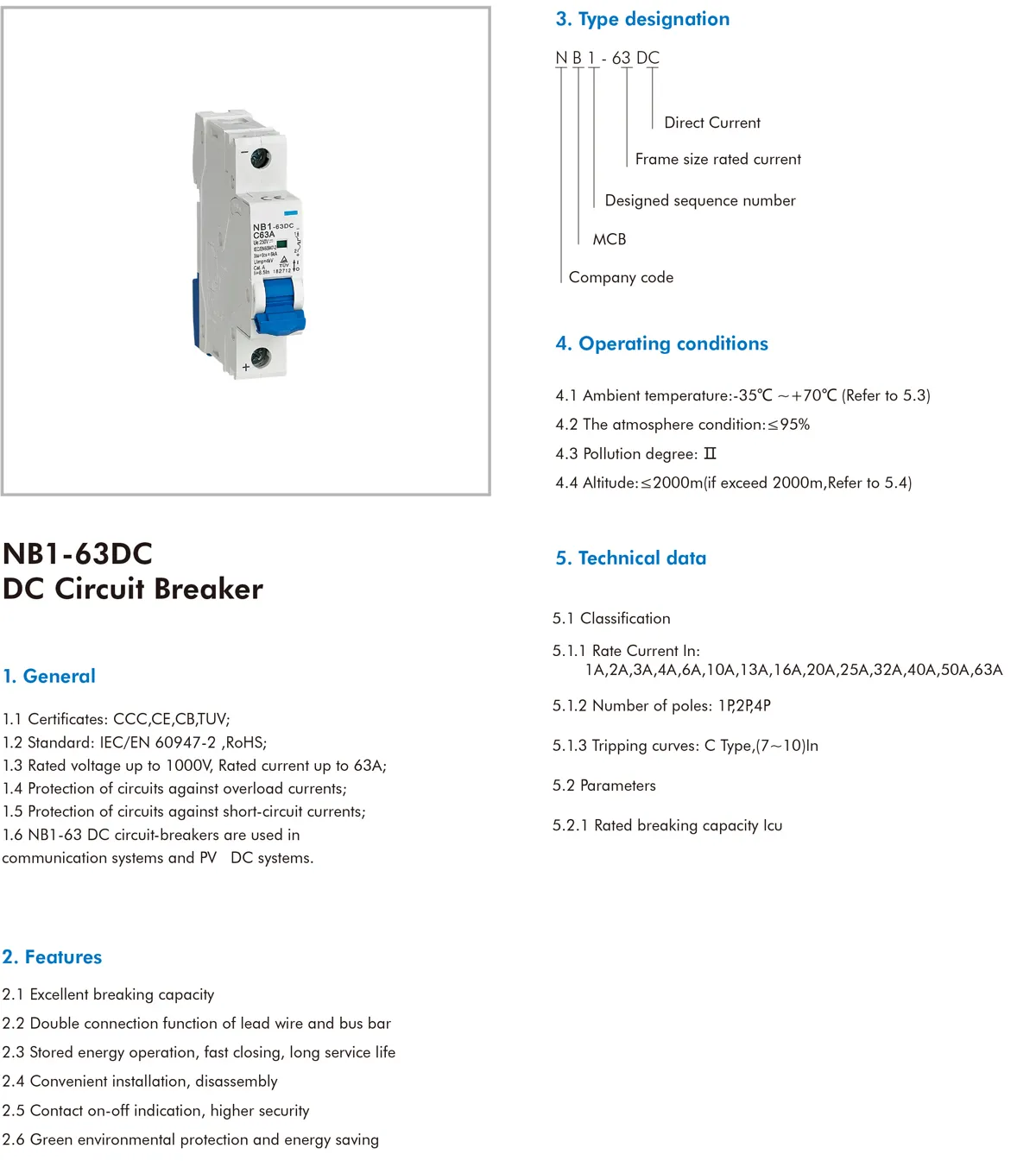 1.5 Protection of circuits against short-circuit currents; 1.6 NB1-63 DC circuit-breakers are used incommunication systems and PV DC systems.