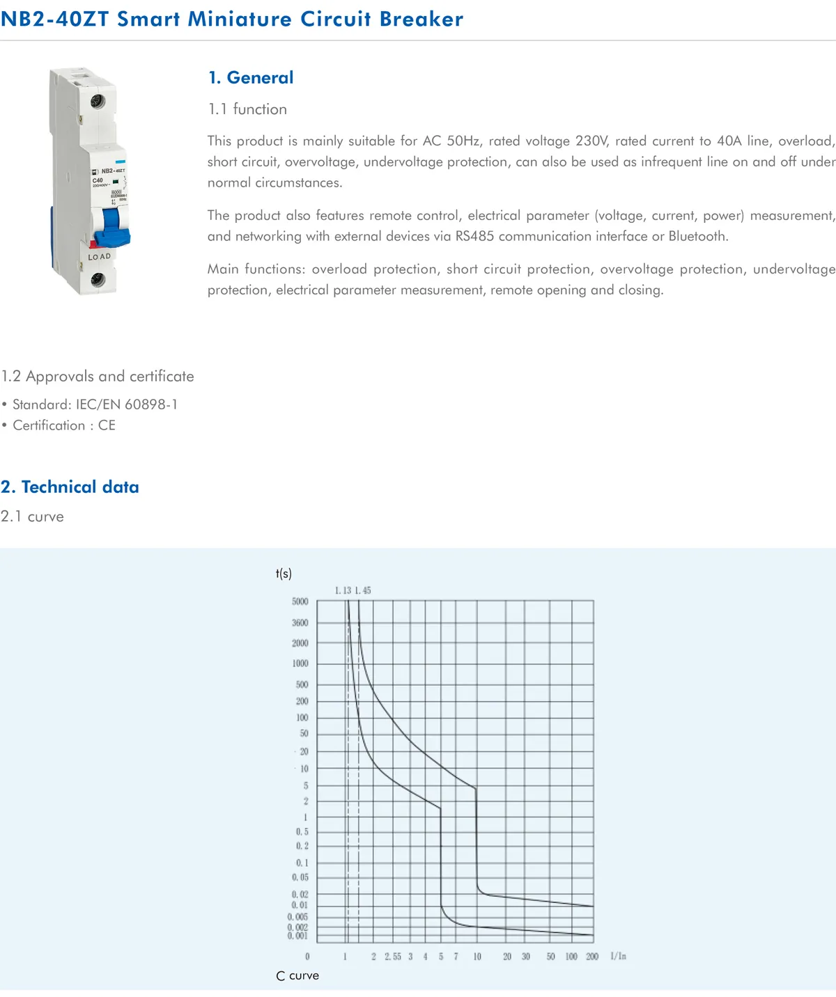 The product also features remote control, electrical parameter (voltage, current, power) measurement, and networking with external devices via RS485 communication interface or Bluetooth