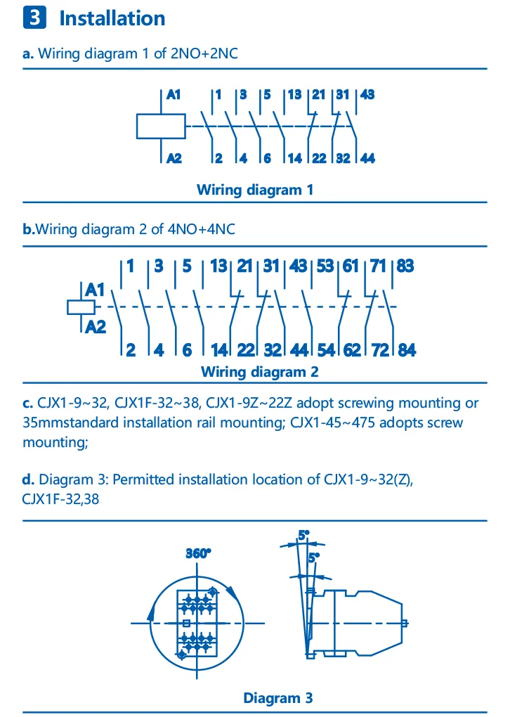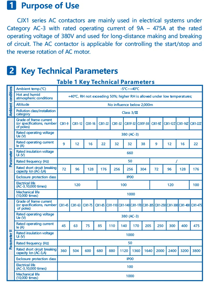 CJX1 series AC contactor is mainly used in AC 50Hz or 60Hz, where the rated insulation voltage is within 660V~1000V, and the rated operational current is 9A~820A while the rated operational voltage is 380V for utilization type AC-3. The contactor functions for switching on and off the circuit remotely, and is applicable for control of starting, stopping and rotating operations of AC motor.