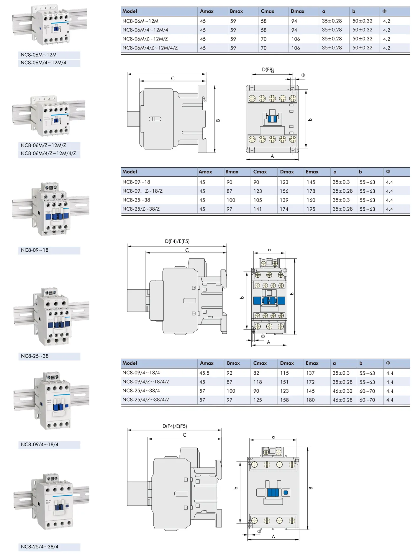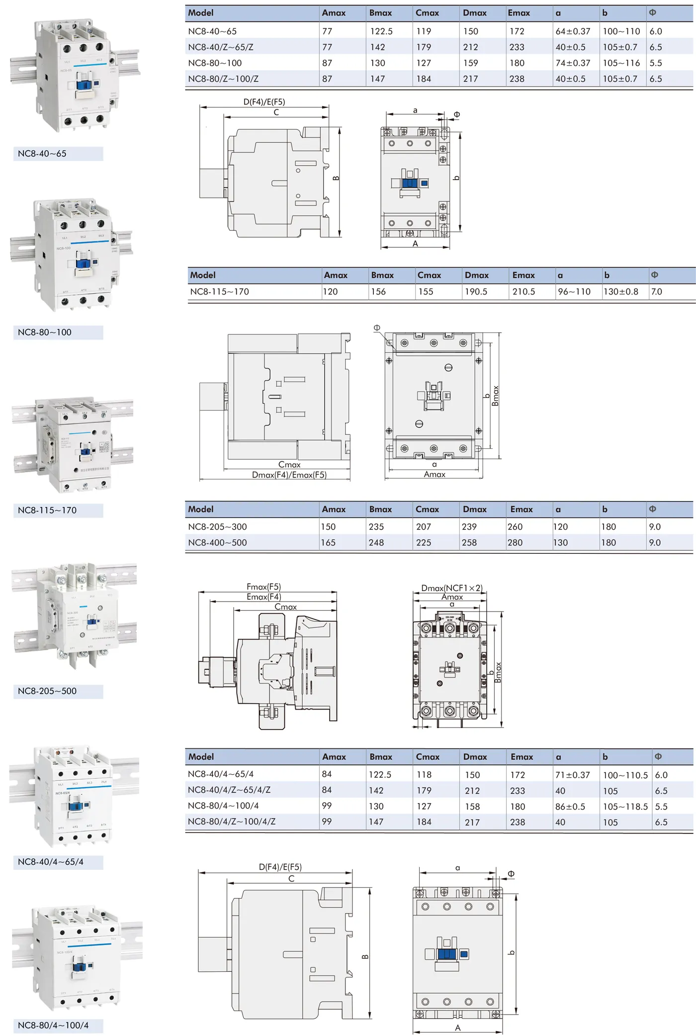 NC8 series AC contactor is applied to circuits with AC current frequency of 50 Hz or 60 Hz, rated operationalvoltage up to 690 V and rated operational current up to 500 A. It is used for remote making & breaking circuits, and can also be used with proper thermal overload relay together as an electromagnetic starter to protect circuits from overload.