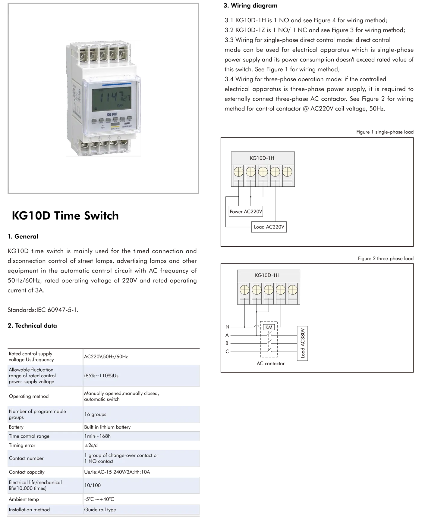 KG10D Time Switch can automatically turn on or turn off power supply of various consumer equipments according to preset time by user. The controlled objects are circuit equipments and household appliances such as street lamps, neon lamps, advertising lamps, manufacturing equipments, broadcast & television equipments, etc., which requires turning on and off at definite time.