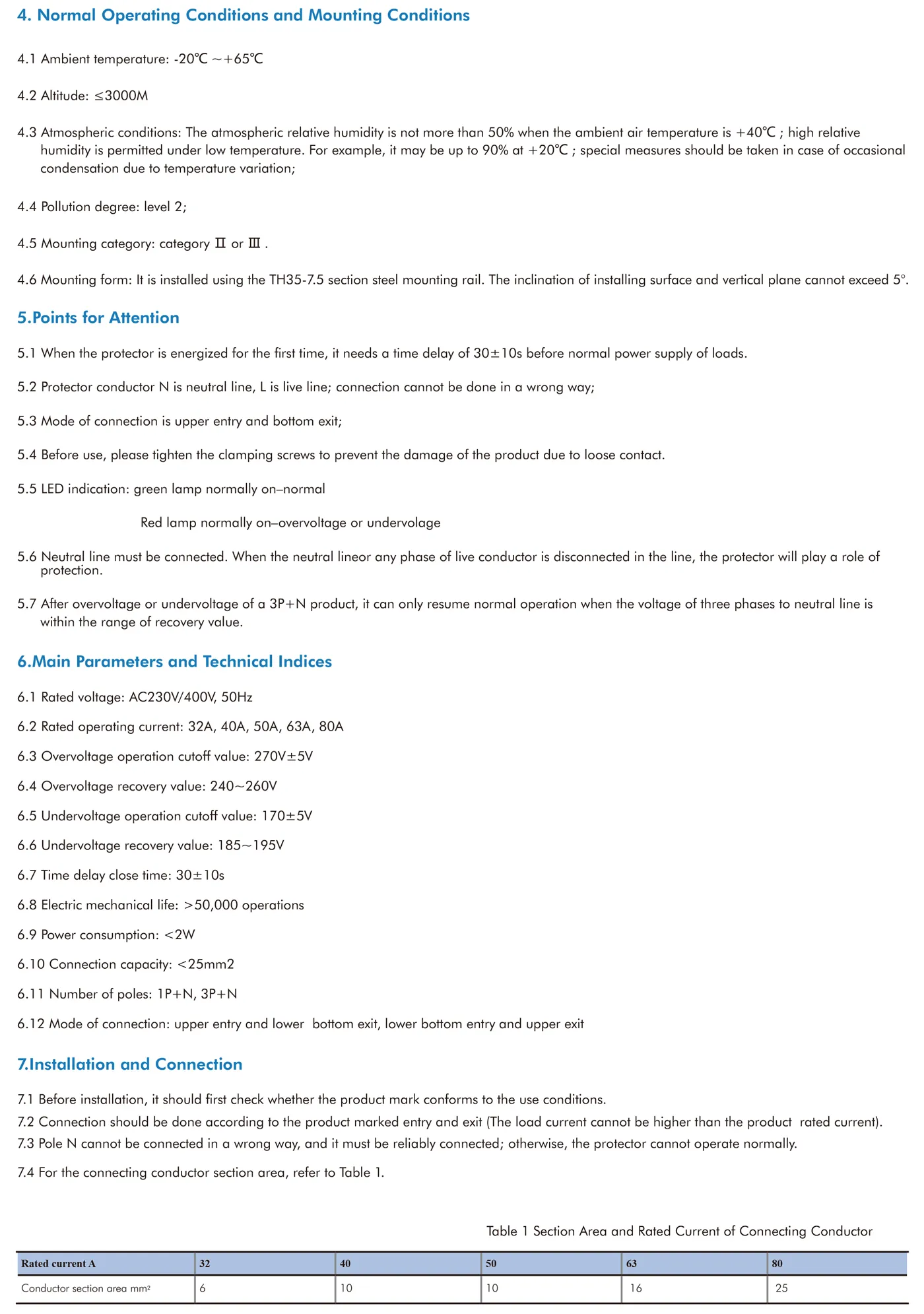 Preventing misoperation: Where sudden transient or temporary overvoltage occurs in the line, the protector will not generate misoperation; when the line suffers instable voltage or sudden power recovery after sudden power disruption due to loose contact or other fault, the protector will not close the circuit;