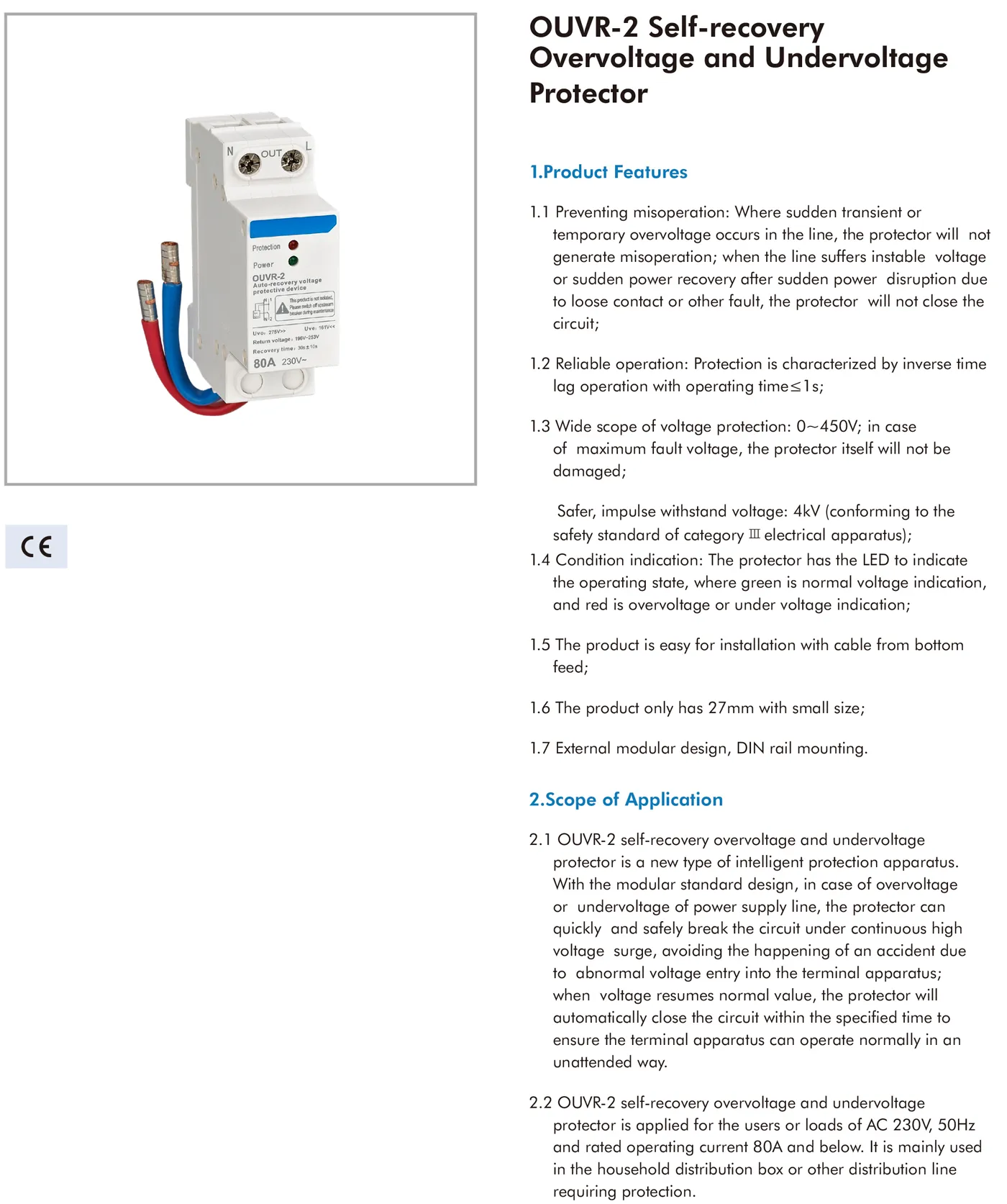 Wide scope of voltage protection: 0~450V; in case of maximum fault voltage, the protector itself will not be damaged;
