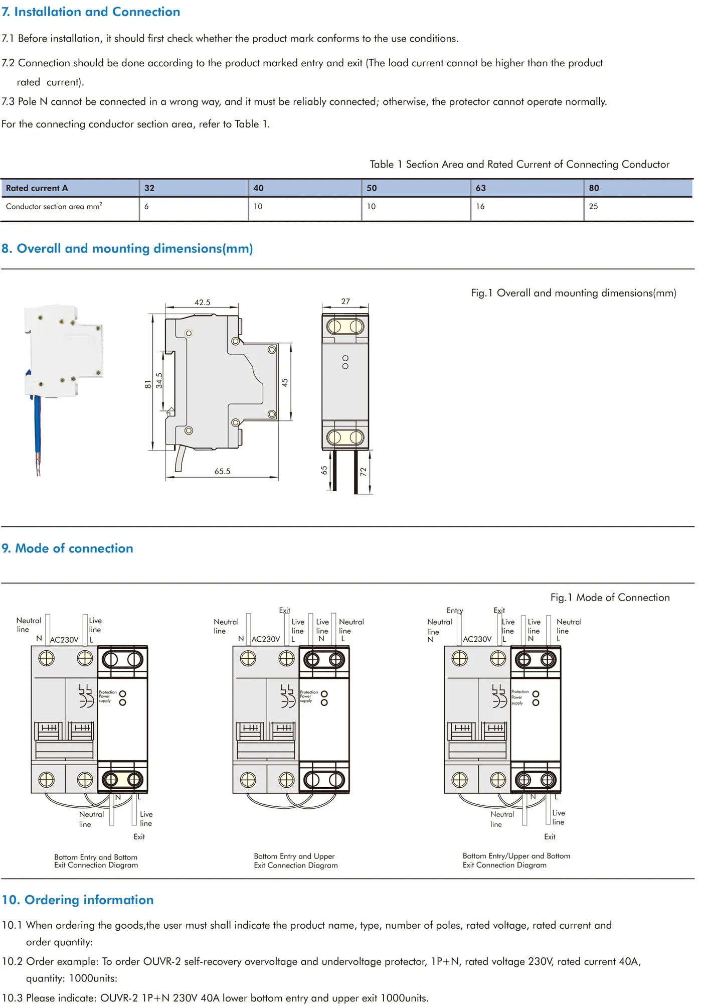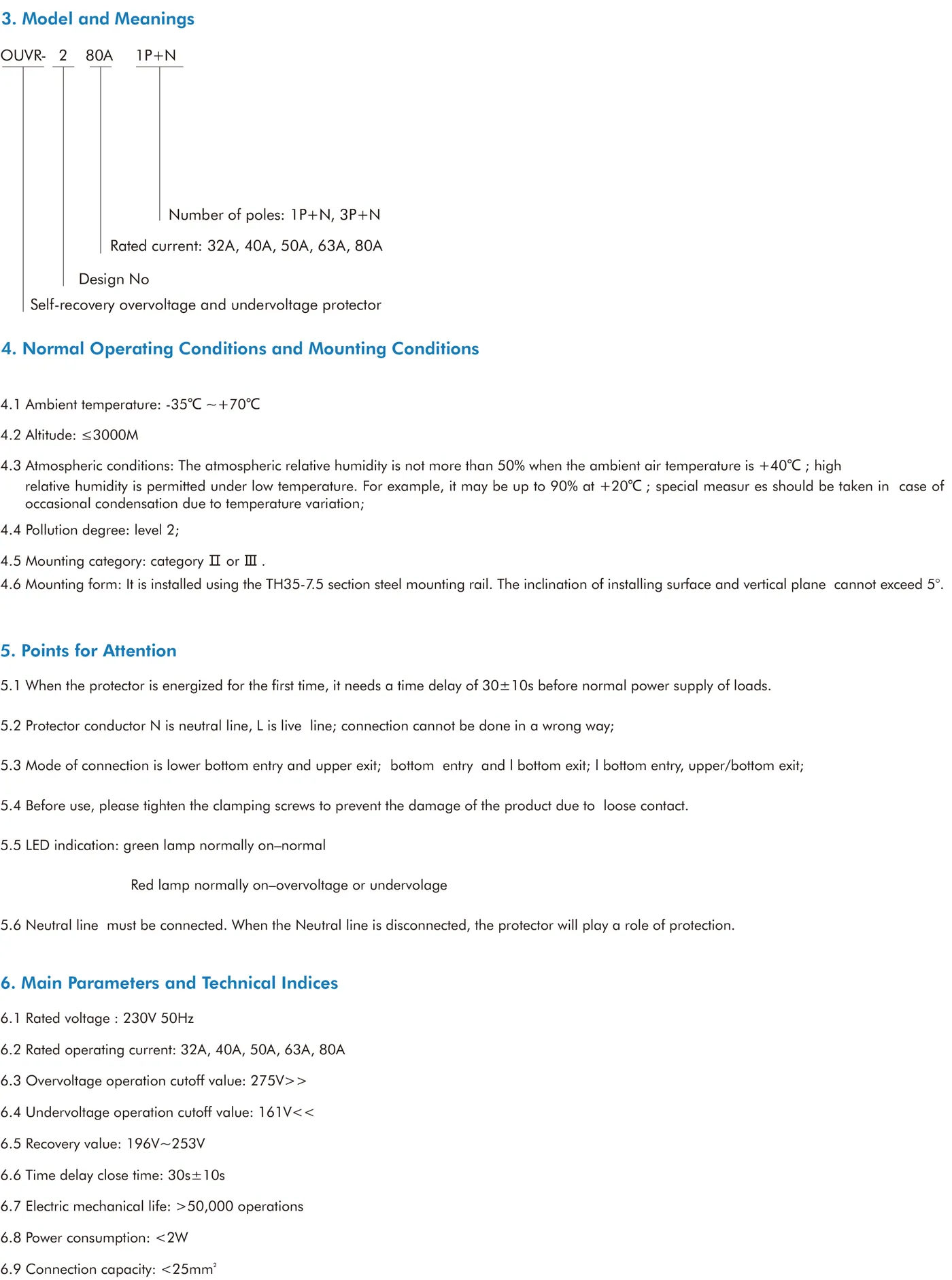 Preventing misoperation: Where sudden transient or temporary overvoltage occurs in the line, the protector will not generate misoperation; when the line suffers instable voltage or sudden power recovery after sudden power disruption due to loose contact or other fault, the protector will not close the circuit;